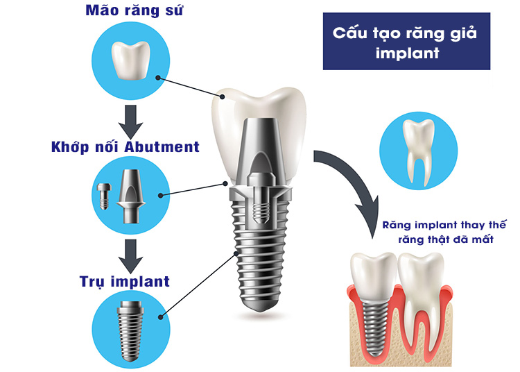 Trồng implant là một kỹ thuật nha khoa tương đối phức tạp. Ở vị trí răng đã mất đi, người ta cấy ghép một trụ implant (làm từ titanium) để thay thế cho chân răng thật, sau đó lắp thêm khớp abutment để kết nối trụ implant với mão sứ ở trên đóng vai trò là chiếc răng giả.